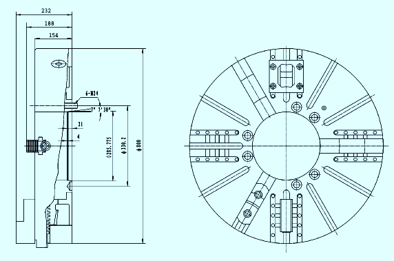 ■特點(diǎn): ☆短圓錐連接。 ☆三爪自定心,四爪單動。 ☆適用于軸類或異形零件。 ■Specificity: ☆Short-taper mounting. ☆Three-jaw self-centring,four-jaw independent. ☆Suitable for machining shaft or special shapes workpiece.