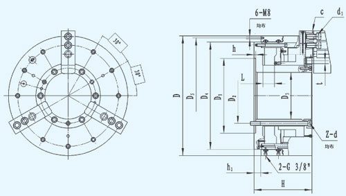 ☆前置式氣動夾緊,卡盤內(nèi)藏氣缸,機床前后可各配一臺卡盤。