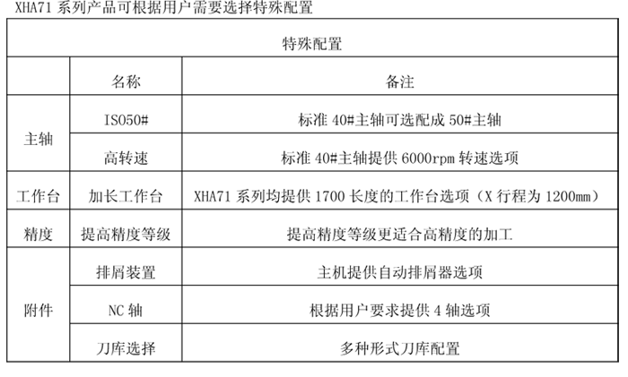 XHA71系列立式加工中心能夠保證低速區(qū)的大扭矩和高速區(qū)的大功率的協(xié)調(diào),主軸剛性高,保證主軸加工時的平穩(wěn)性和強(qiáng)力切削實(shí)現(xiàn)零件的高表面光潔度。