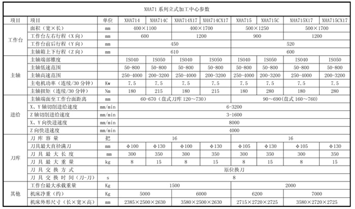 XHA71系列機(jī)床是使用范圍很廣的立式加工中心,它的橫向(Y向)移動由底座上的滑座來完成,滑座上的工作臺可縱向(X向)移動,立柱上的主軸箱可進(jìn)行垂向(Z向)移動。工作臺、滑座、主軸箱的移動共同組成了機(jī)床X、Y、Z三個軸線方向的運(yùn)動,可實(shí)現(xiàn)三坐標(biāo)三聯(lián)動。三坐標(biāo)均為滑動導(dǎo)軌,具有承載大、運(yùn)動平穩(wěn)、剛性好的特點(diǎn)。